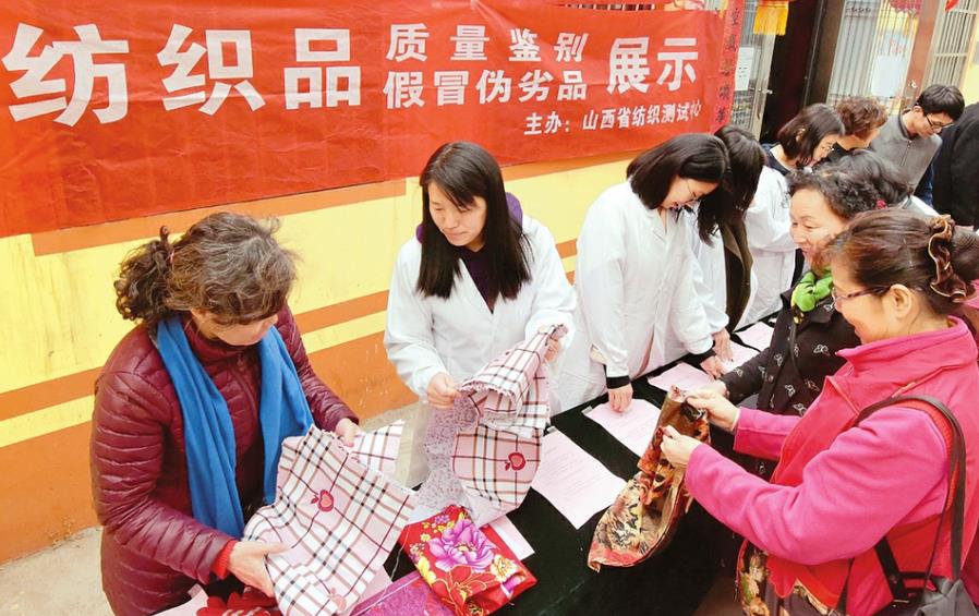 3月15日,省纺织测试中心的工作人员来到太原市水西关三社区,认真地给社区居民讲授如何鉴别假冒伪劣产品安全知识。本报记者 王瑞瑞摄